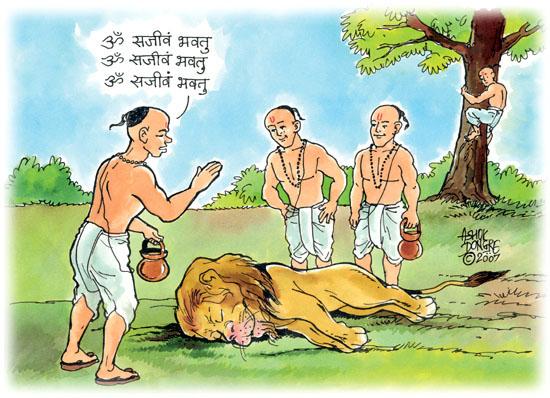 Char Dost Aur Sher (Dost-Sher) is a story from Panchatantra involving 4 friends and a lion. Three of the four friends try to use their knowledge in the wrong place and in the process bring a dead lion back to life. The fourth friend warns them not to do so but they disregard his advise. The lion on getting alive again kills the three friends. The fourth friend uses his common sense and climbs a tree and saves his life.